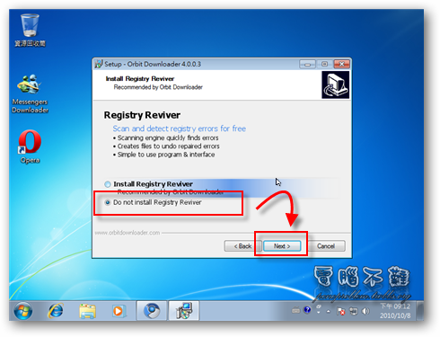 第6步 選擇「Do not install Registry Reviver」,以免它幫你亂安裝沒用的軟體,按下「Next >」。