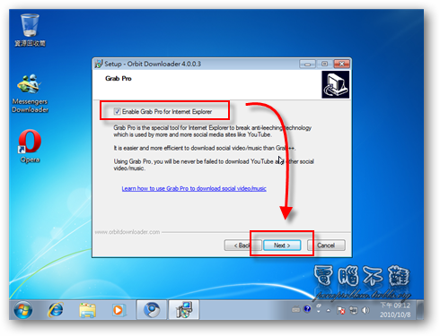 第7步 勾選「Enable Grab Pro for Internet Explorer」,才能在IE開啟Grab Pro按下「Next >」。