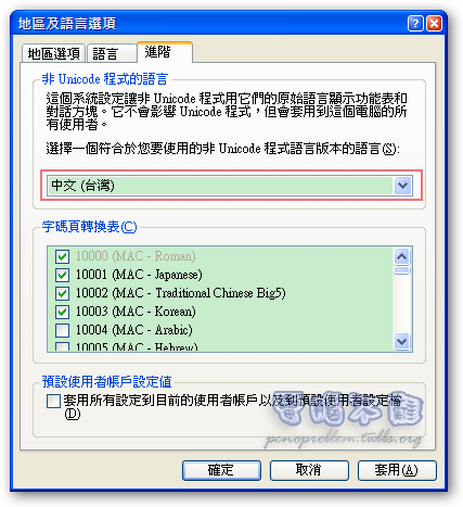 「開始」→「控制台」→「地區及語言選項」→「進階」標籤頁→變更「選擇一個符合於您要使用的非Unicode程式語言版本的語言」的選項(日文軟體就選日文,以此類推)→重新開機