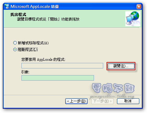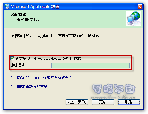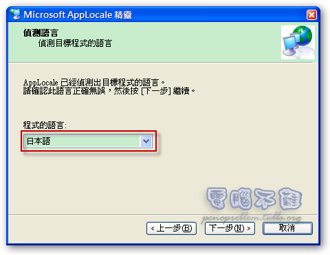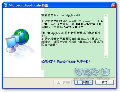 這套pAppLocale是由好心的網友piaip修改Microsoft Applocale而成的,pAppLocale修正Microsoft Applocale原有的一些bug與不便,例如修正以Windows Installer封裝的安裝程式在執行時出現亂碼、修改透過AppLocale執行應用程式時總是會出現提示注意事項的對話視窗。