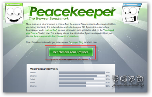 利用上面的網址進入Peacekeeper後,點選「Benchmark Your Browser」按鈕,即可開始測試你現在在用的瀏覽器。