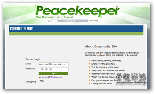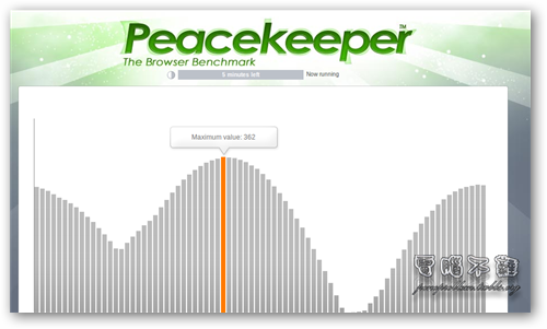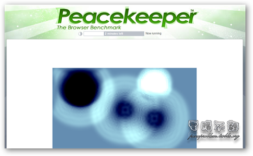 Peacekeeper是一個專門測試瀏覽器效能的網站,使用上沒什麼大困難,完美的自動化。不過要注意的一點是,測試時是拿你的電腦來run,而不是用網站伺服器來run的。所以測試時為了確保數據正確,請儘量關閉其他的應用程式,讓你的電腦全力來解Peacekeeper出的難題。