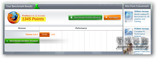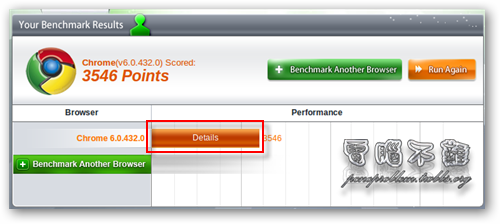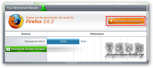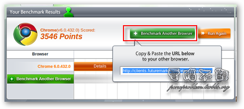 如果想在同一個頁面比較瀏覽器的話,那就在第一個瀏覽器測試完後,在顯示結果的那個頁面上,點擊「Benchmark Another Browser」按鈕,然後會出現網址。