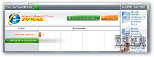 Internet Explorer 8.0 得到347點 (為了測試IE,我還特地開了VirtualBox來跑XP,測試結果嚇了我一大跳,太低了吧~)