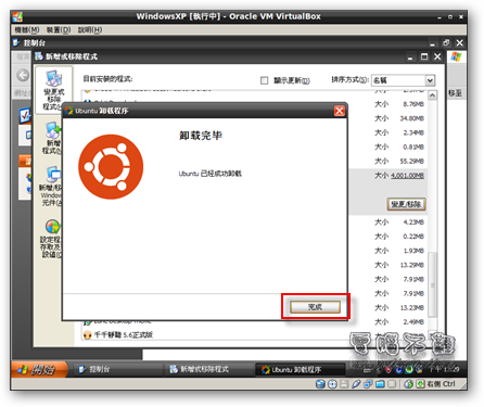 在Windows作業系統下的「新增/移除程式」即可移除掉Ubuntu。移除後開機選單也會被還原。