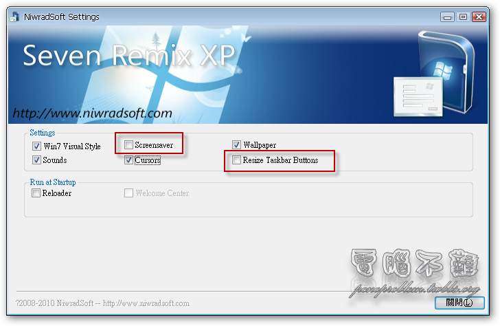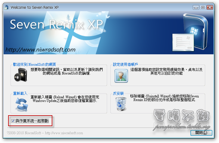步驟九 重新開機後,會發現視窗介面真的變漂亮了,而且還自動跳出一個Seven Remix XP的歡迎畫面,建議把「與作業系統一起啟動」取消勾選。