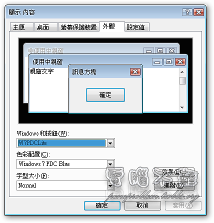 另外還可以在桌面按下「滑鼠右鍵->內容」,進入「外觀」標籤頁,來選擇想要的Seven Remix XP主題喔!