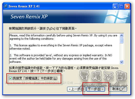 步驟三 稍微看一下授權條款,勾選「我接受…」,按「下一步」繼續。