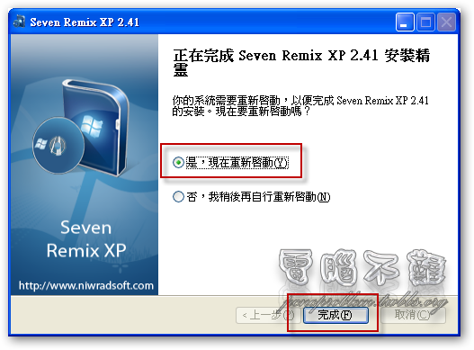 步驟八 它會問你是否要重新啟動電腦,選擇「是,現在重新啟動」,按下「完成」。