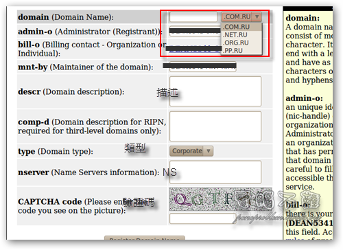 domain是網域名稱,右邊可以選擇別種域名。descr是網域描述。tpye是網域類型。nserver是主機的NS伺服器,一般會有至少兩個。CAPTCHA code是驗證碼。
