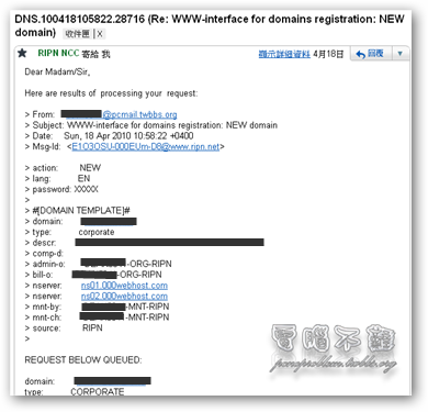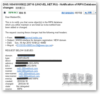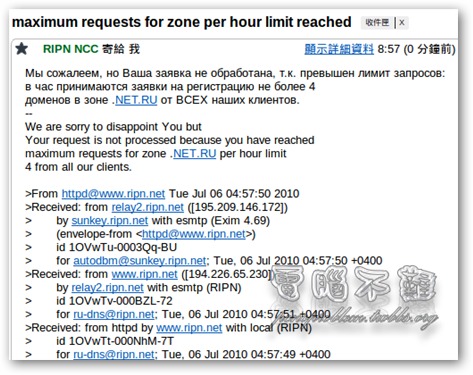 如果你沒搶到RU網域,會收到一封標題為「maximum……」的信件,代表這個整點開放的名額已經用完了。當然或許只是伺服器還沒重新計算名額,建議如果有耐心的話就從56分奮戰到1分,或是換個RU域名試試看(例如.NET.RU換成.PP.RU)。