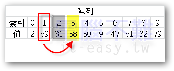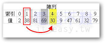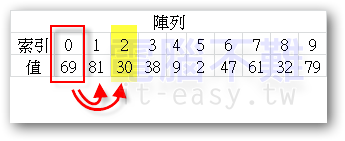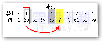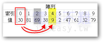 此時[索引0]所存放的值就是30,還要再跟[索引3]之後的數比大小。38比30大,不換位置。30再跟9比大小,9比30小,要換位置。如下圖: