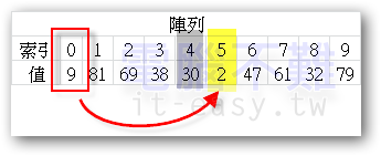 此時[索引0]所存放的值又變成9,然後再跟[索引5]的2比大小,又要再換一次位置。