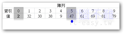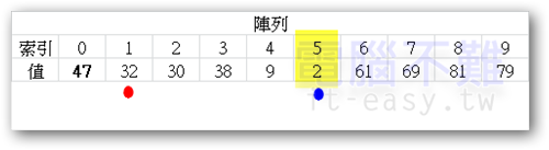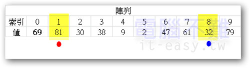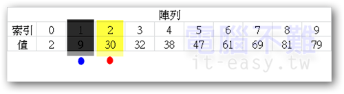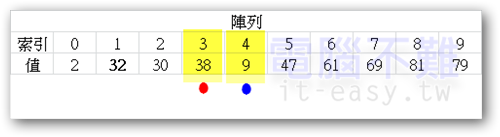 經過搜尋後,紅、藍點都各自找到了自己的歸屬,且紅點在藍點的左邊。所以他們所指的索引元素值得互相交換。