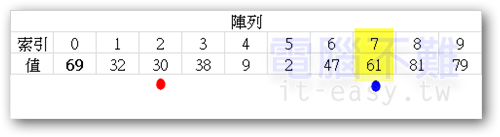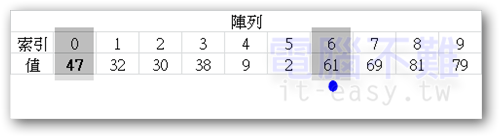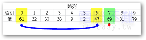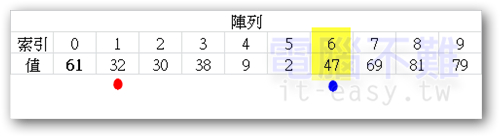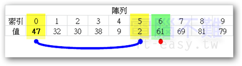 交換後,pivot值變為61,依然在[索引0]上。藍點所指的索引位置不變,但紅點得重新計數。
