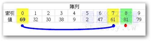 從上圖來看,我們可以發現在不知不覺中[索引0~7]都已經遞增排好了,剩下沒排的就是[索引8、9]。將pivot點跳到[索引8],再搜尋一次,紅點又跑到藍點右邊。故[索引8]的值要跟藍點所在的[索引9]值調換。