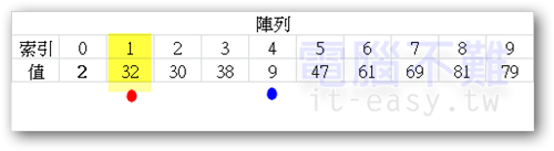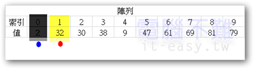 當藍點不幸移動到pivot點的位置,則pivot要往右移一格。原先的pivot點,也就是[索引0]的值就固定不變了。無論是紅點或是藍點都無法觸及。現在的pivot值為32,紅藍點要回到起點重新出發。(紅點起點在pivot的右邊一格;藍點起點在陣列的最右邊)