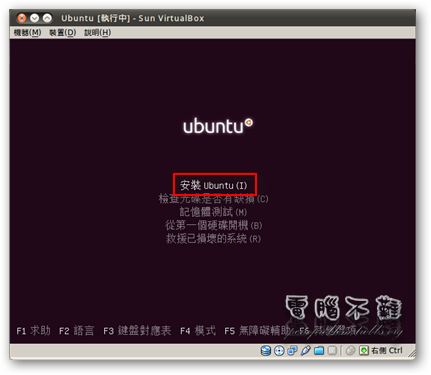 步驟三 進到光碟選單後,會發現沒有出現Desktop Live CD的「在不需安裝的情況下試用Ubuntu」選項,因為Alternate並沒有Live CD免安裝預覽Ubuntu的功能。有許多人問過我,為什麼在開機選單下找不到那個試用的選項?那就是你下載到Alternate版本的CD了!在此我們是要安裝Ubuntu,因此選擇「安裝 Ubuntu」。