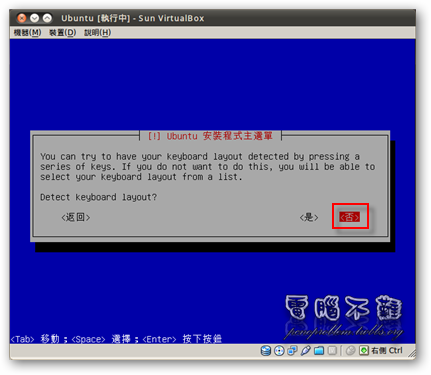 步驟四 等一段時間後會進入藍底灰框黑字的畫面,這就是所謂的文字介面了。剛開始會先叫你設定鍵盤,正來來說預設即可,也不用測試,因此按「否」。