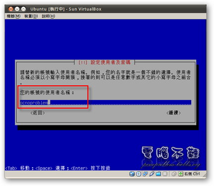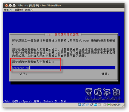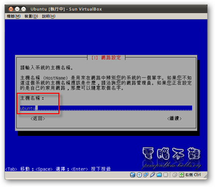 步驟七 輸入自己想要的主機名稱,就是為自己的電腦取個名字。像這些要輸入文字的部份,輸入完成後按下「Enter」即可進入下一個步驟。