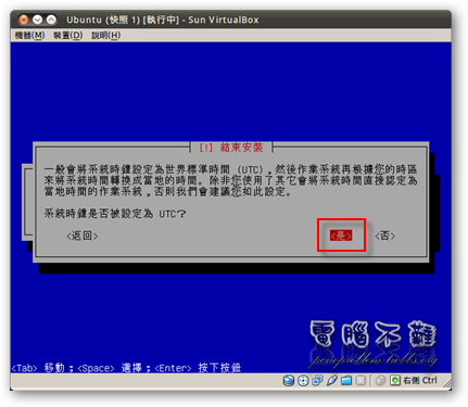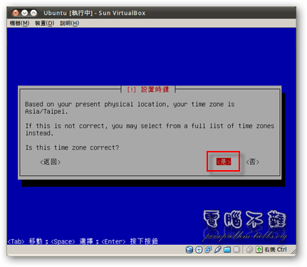 步驟九 如果要照它預設的時區(這裡是寫Asia/Taipei,也就是台北時區),就選「是」。