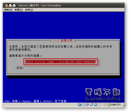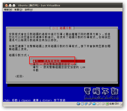 步驟十 設定Ubuntu的存在地點,我以普通的「使用整顆磁碟」為例。