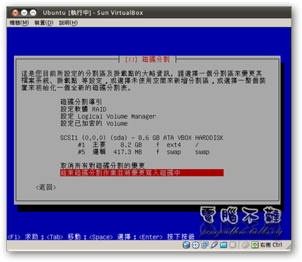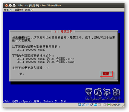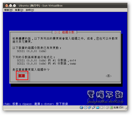 步驟十二 接著會要你確認分割區的設定,如果不對,可以按「否」回去修改。正確的話就選「是」吧。