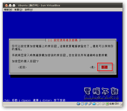步驟十五 一般的使用者其實不太需要加密個人目錄;如果電腦只有自己在使用,每次開資料夾都還要輸入密碼,不是很麻煩嗎?所以選「否」。當然,並不是每個人的情況都是一樣的,還是要依自己的狀況進行設定。