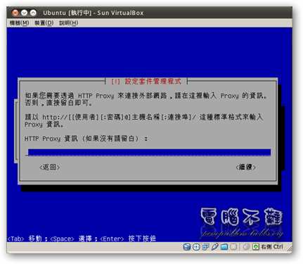 步驟十六 如果你需要透過代理伺服器(proxy)連上網路,那就在這裡輸入代理伺服器的連線資訊,否則請留白。
