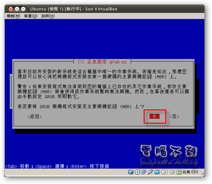 步驟十九 寫入MBR的開機程式。在這裡要選擇「是」,若沒有在MBR寫入執行GRUB的程式,就沒辦法進入Ubuntu作業系統。
