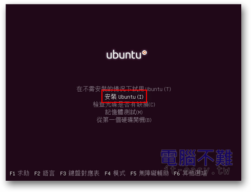 步驟一 完成Ubuntu Live CD或是Live USB後,我們要用Live CD或Live USB來進行開機的動作。若你不會使用BIOS設定光碟開機,請參考這篇;若你不會使用USB開機,請參考這篇。