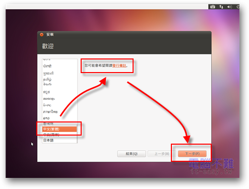 步驟五 進入安裝畫面,在左邊選擇要安裝的語言。如果有看到「您可能會希望閱讀發行備註」,代表你目前是連上網路的狀態,此時可以直接按下「下一步」繼續。