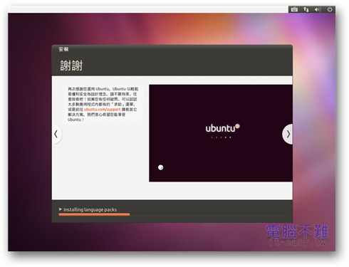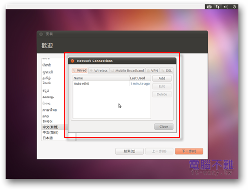 備註:安裝Ubuntu不一定要連上網路,連上網路的用意是能在安裝時就順便下載好完整的語言套件,以及一些擴充功能。因此如果你一直無法藉由設定Network Manager的方法連上網路,請別擔心,還是可以正常安裝Ubuntu的!