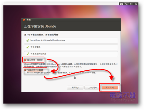 步驟六 Ubuntu 11.04的安裝程式蠻貼心的,在安裝前會提醒你確認你的電腦是否有足夠的空間、是否插上電源、是否連接到網際網路。在下面的部份,有兩個選項可以選。如果你想要讓你的Ubuntu擁有更強大的影音支援,建議兩個都打勾,然後按下「下一步」。