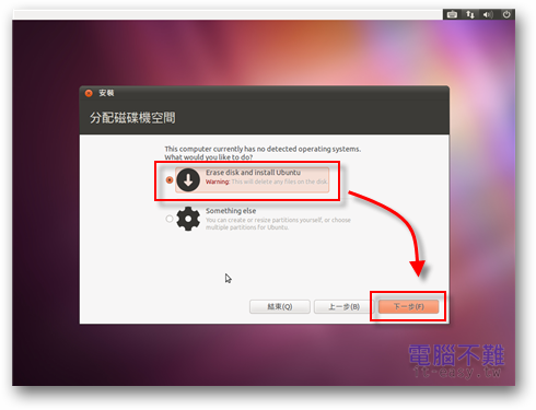 步驟七 若你尚未安裝任何作業系統,建議選擇「Erase disk and install Ubuntu」(消除並使用整個磁碟),按下「下一步」。