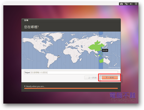 步驟九 開始進行安裝。Ubuntu 11.04的安裝程式允許使用者可以在前段的安裝程序執行時,進行一些個人設定的項目,節省等待時間。一開始要設定時區,一般來說都會隨著你選擇要安裝的語言而幫你預設好,如有特殊需求再進行更改,否則直接按下「下一步」。