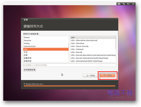步驟十 選擇鍵盤排列方式。基本上不用去動它,按下「下一步」即可。