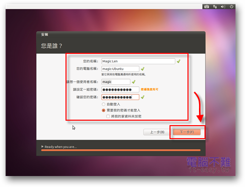 步驟十一 設定使用者,照自己喜好設定,按下「下一步」。