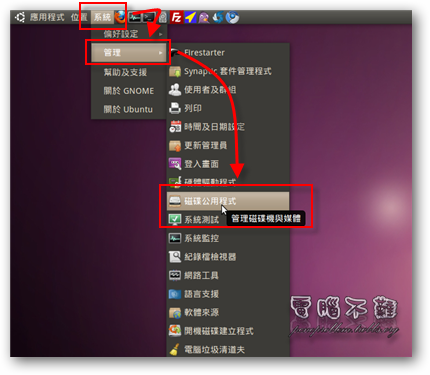 在Gnome選單下的「系統→管理」中,可以找到「磁碟公用程式」。