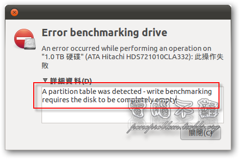 出現錯誤訊息「A partition table was detected – write benchmarking requires the disk to be completely empty」,意思是硬碟必須在毫無任何資料的情況下才能進行寫入的測試。這是Ubuntu磁碟公用程式比較不方便的地方,應該是為了獲得更準確的數據才這樣設計的。