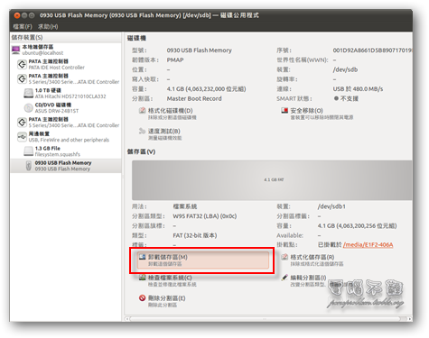在上面的文章中有提到要用隨身碟來示範清空資料然後再測試讀寫速度,因此,我們要先將隨身碟的磁區「卸載」下來,才能正常地對它進行格式化的動作。按下「卸載儲存區」按鈕。