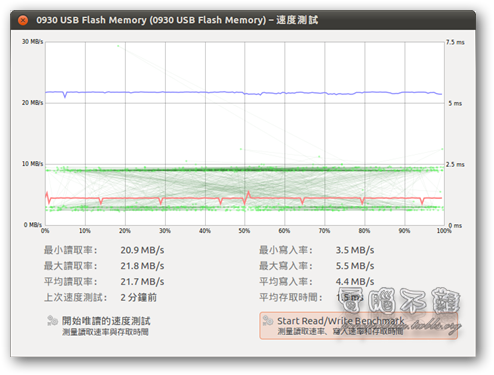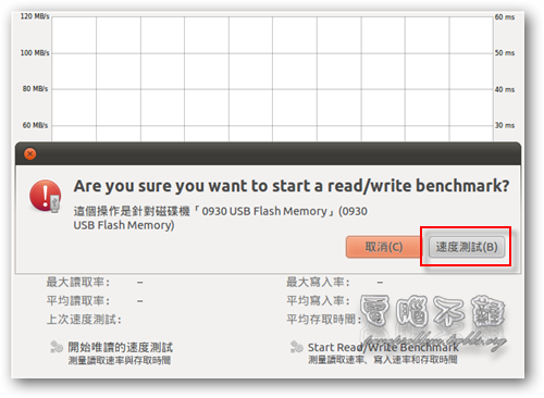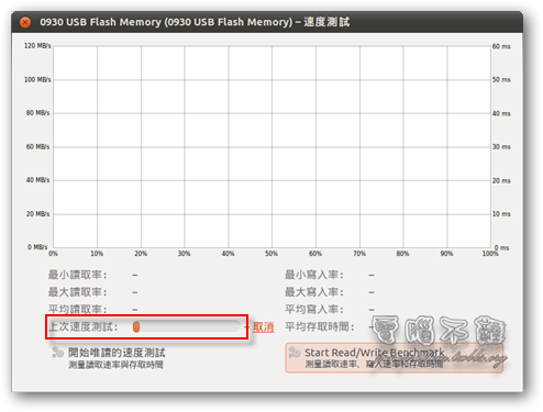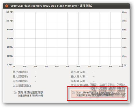 開始測試隨身碟的讀寫速度(Start Read/Write Benchmark)。
