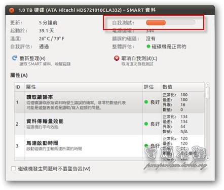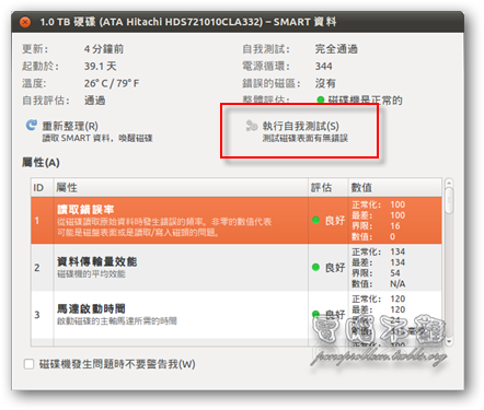 欲檢視硬碟的SMART資訊,只要按下「SMART 資料」的按鈕即可。接著會挑出SMART資料視窗,若想更進一步地測試硬碟是否有錯誤,可以按下「執行自我測試」按鈕。