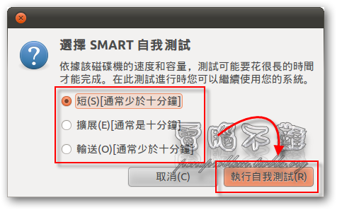 測試方式有三種,第一種稱為「短」,會進行一般的測試,大約不到5分鐘即可測試完畢。第二種稱為「擴展」,會進行較深的測試,可能要三個小時才能測試完畢。第三種稱為「輸送」,進行較簡易的測試,約不到1分鐘即可測試完畢。測試所需時間與硬碟的讀寫速度成反比,與容量大小成正比。選擇要使用的測試模式後,按下「執行自我測試」的按鈕。