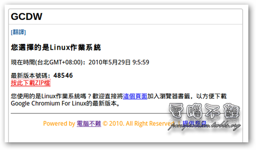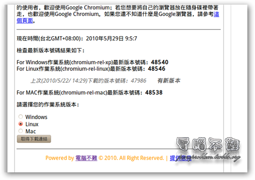 Chromium的取得比較麻煩,因為它不是Google瀏覽器的正式成品,因此Google並不會大剌剌的放在Google瀏覽器的下載首頁上供人下載。要下載Chromium原則上是要到Chromium的開發網站上去找,相當麻煩。因此本站提供了網頁程式(Google Chromium Downloader Web,簡稱GCDW),能夠直接取得Chromium最新版本的下載點,還有分三種作業系統版本(Windows、Linux、MAC),如果是用Ubuntu,當然是選擇Linux版本了。