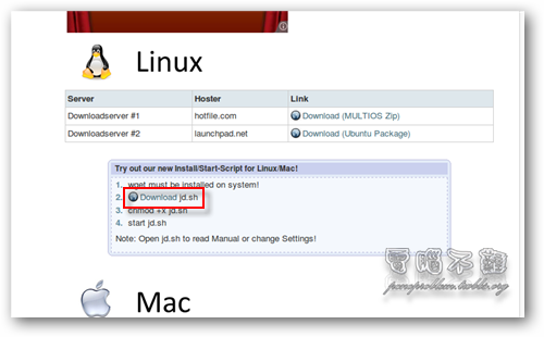 步驟一 首先利用上面的連結進入JDownloader的官方網站,接著找到「Download」下載頁面,連進去後就可以看到各種JDownloader版本的下載點與下載方法。找到Linux分類,下載官方提供的「jd.sh」檔案。