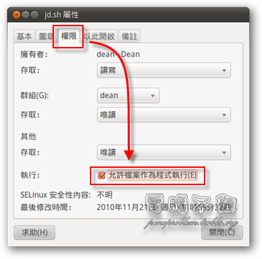 步驟二 更改jd.sh的權限為「允許檔案作為程式執行」。在jd.sh檔案上按下滑鼠右鍵,選擇「屬性」,出現屬性視窗,進入「權限」標籤頁,勾選「允許檔案作為程式執行」。