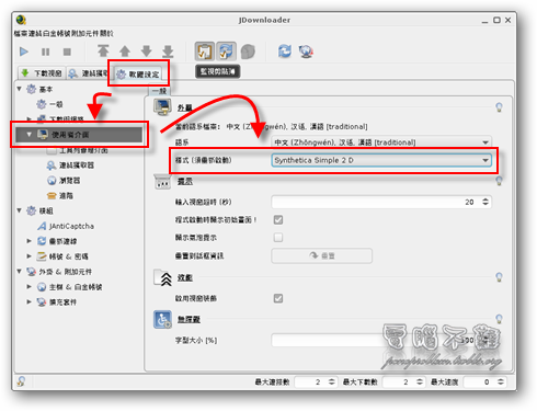 步驟八 在JDownloader的「軟體設定」分頁中的「使用者介面」分類,可以設定JDownloader的介面風格。