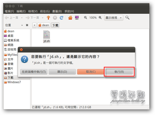 要執行JDownloader,一樣是利用jd.sh這個檔案。「執行」jd.sh,即可開啟JDownloader。