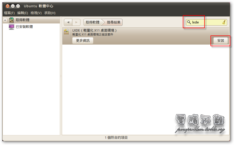 首先進入Ubuntu 軟體中心,在搜尋框的地方輸入「lxde」,大小寫都無所謂。接著便能搜尋LXDE,按下安裝即可。另外也可以使用終端機指令「sudo apt-get install lxde」來安裝。